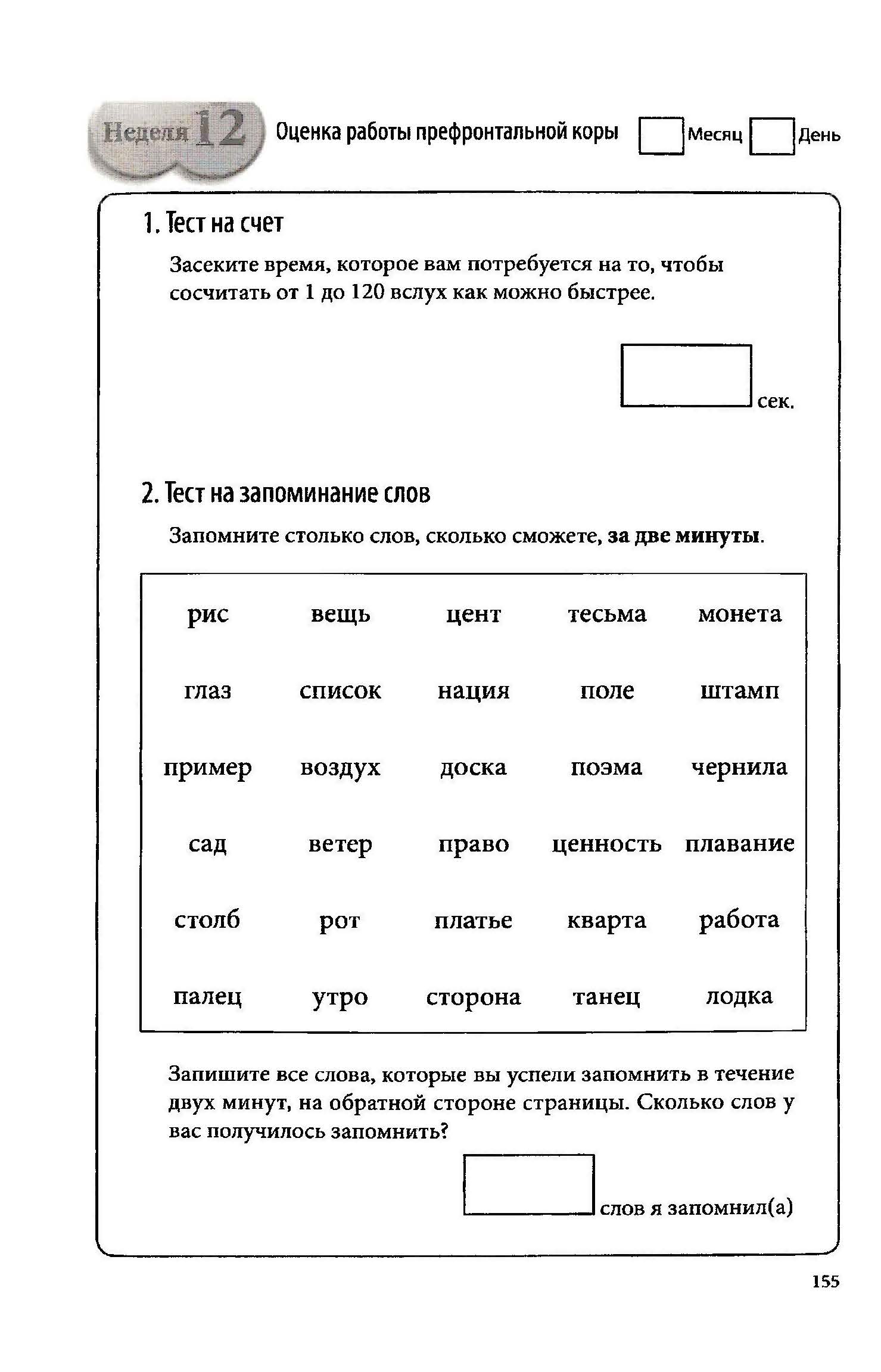 Her kelime sayfası 30 basit kelime veya kelime öbeği içerir. Lütfen iki dakika içinde ezberleyebildiğiniz kadarını ezberlemeye çalışın. Bu sürenin sonunda sayfayı çevirin ve hatırlamayı başardığınız tüm kelimeleri yazın. Doğru şekilde çoğaltılan kelimelerin sayısı puanınızdır. Bu egzersizin amacı, beynin sol yarıküresindeki kısa süreli hafızadan sorumlu bölgenin aktivitesini değerlendirmektir.