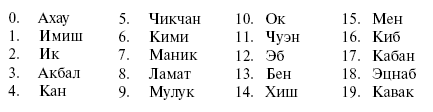 Sıfır akraba, sıfır uinal, sıfır tun, sıfır katun, on üç baktun. Maya takviminin ilk tarihi (sağdan sola) böyle görünüyor ve okunuyor.