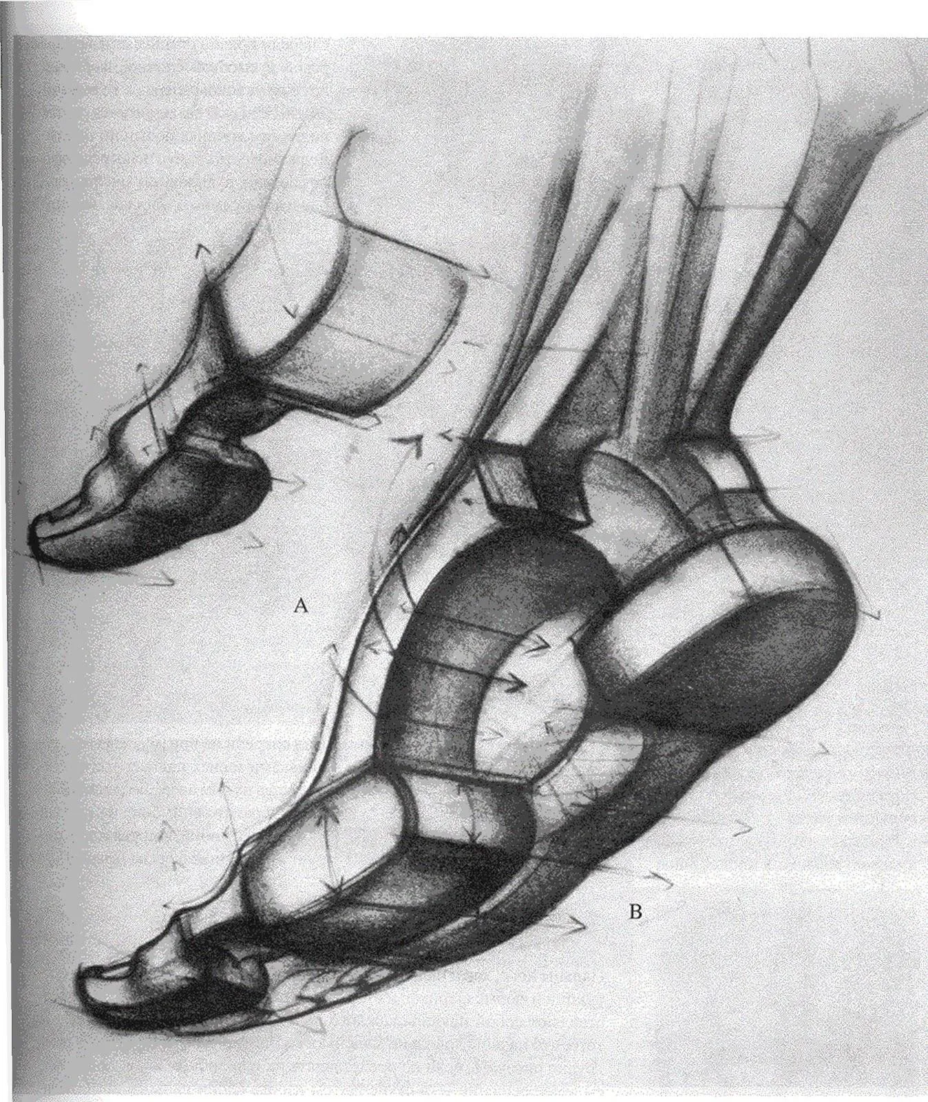 İşte söylediklerimizin bir örneği. Örnek A'da bacak doğrudan önden gösterilmiştir. Bacak uzunluğunun aşırı alt ve üst konumları, paralel izdüşüm çizgileri kullanılarak anahtar figürün sağ tarafına aktarılır. Bir dizi kontrol işareti, sağ tarafta oluşturulan projeksiyonun konturunu ayarlar. Örnek B'de, eşdeğer konturun bacağının silueti, doğru şekilde yerleştirmek için örnek A'daki şekillerin kontrol konumları kullanılarak iç ayrıntılar olmadan çizilir. Örnek C'de örnek B'de kullanılan silüet aynı referans işaretleri kullanılarak tekrarlanmıştır. Ancak şimdi, ana hattın şekli, arka görünümün ön tarafından tamamen ters bir görünüm oluşturmaya hizmet ediyor. Buradaki ana kriter, bu şekilde yansıtılan konturun ana hatlarının, arkasındaki formların yerini kaybetmesine izin vermemesidir. Bu prosedürün sonunda, ayak vuruşunu net bir şekilde yansıtmaya yardımcı olan bağlantı çizgileriyle arka görüşün nasıl iyileştirildiğine dikkat edin. Ayrıca topuğun yükseltilmesi ve tabanın dış kenarının küçük parmağa doğru kaydırılması nedeniyle ayak parmağının nasıl açıldığına dikkat edin.
