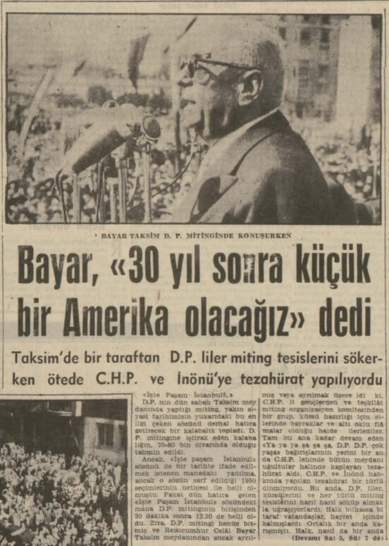 Bayar’ın bahse konu mitingde kullandığı ifadelerin “Biz memleketimizde Amerikalıların ilerleyişleri seyrini takibe çalışmaktayız. Öyle ümit ediyoruz ki otuz sene sonra bu mübarek memleket, 50 milyon nüfusu ile küçük bir Amerika olacaktır.” şeklinde olduğu belirtilmektedir.